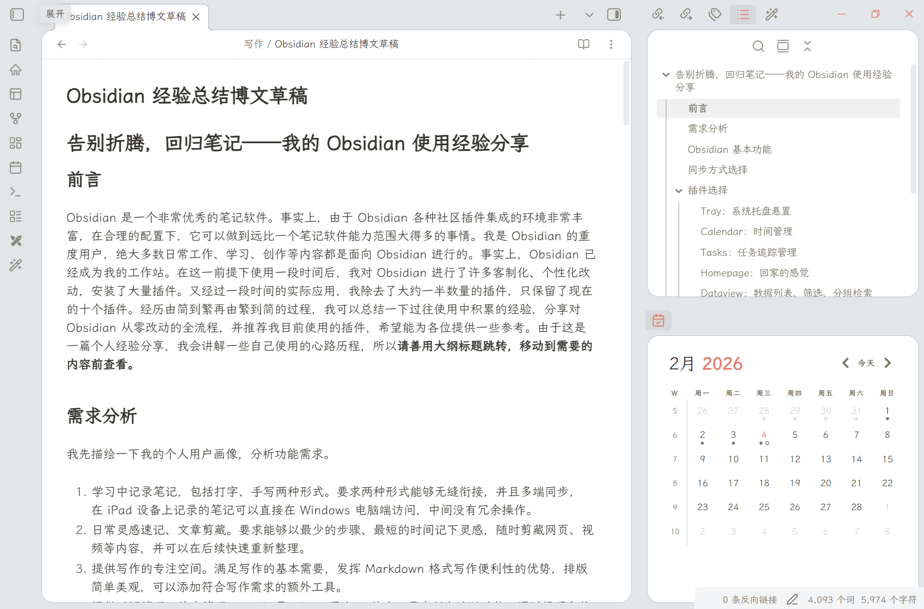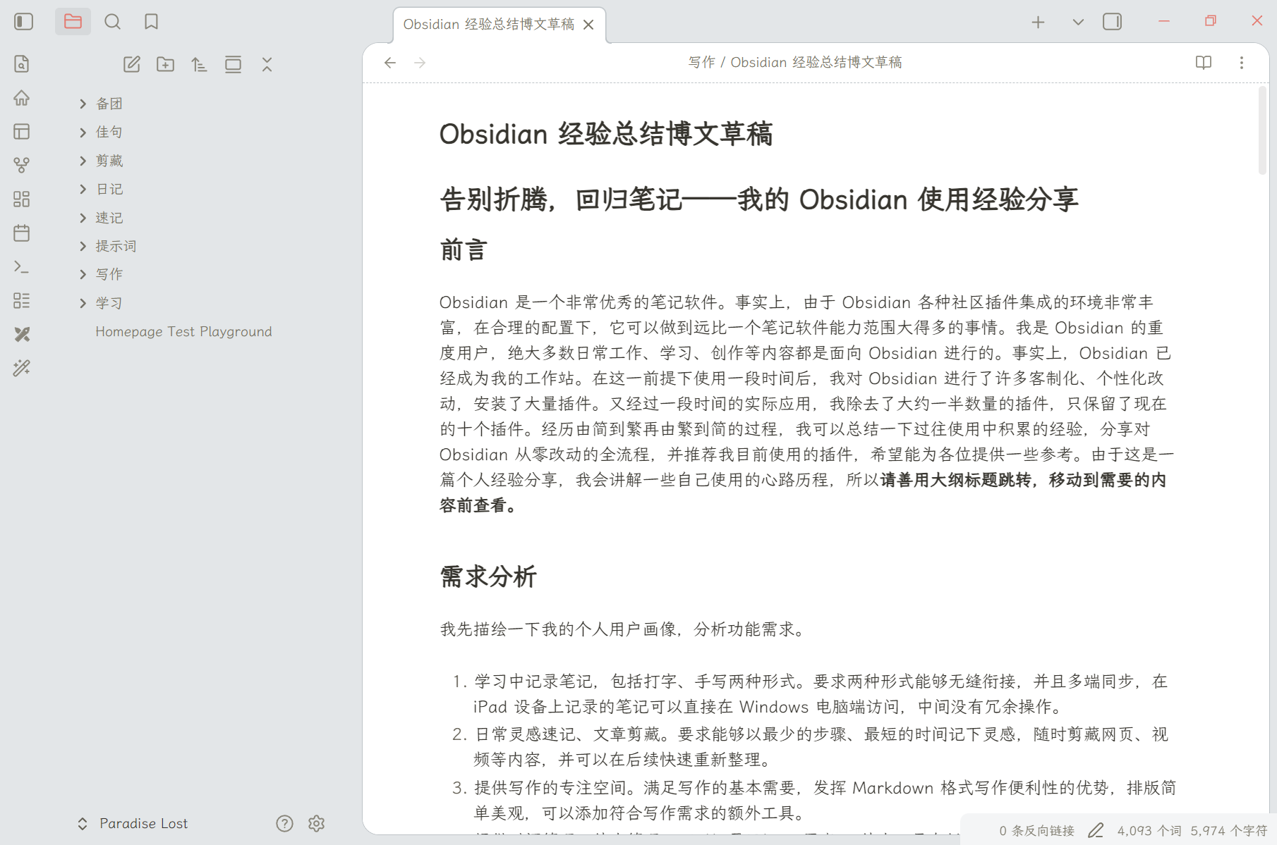 Obsidian 是一个非常优秀的笔记软件。事实上,由于 Obsidian 各种社区插件集成的环境非常丰富,在合理的配置下,它可以做到远比一个笔记软件能力范围大得多的事情。我是 Obsidian 的重度用户,绝大多数日常工作、学习、创作等内容都是面向 Obsidian 进行的。事实上,Obsidian 已经成为我的工作站。在这一前提下使用一段时间后,我对 Obsidian 进行了许多客制化、个性化改动,安装了大量插件。又经过一段时间的实际应用,我除去了大约一半数量的插件,只保留了现在的十个插件。经历由简到繁再由繁到简的过程,我可以总结一下过往使用中积累的经验,分享对 Obsidian 从零改动的全流程,并推荐我目前使用的插件,希望能为各位提供一些参考。由于这是一篇个人经验分享,我会讲解一些自己使用的心路历程,所以请善用大纲标题跳转,移动到需要的内容前查看。