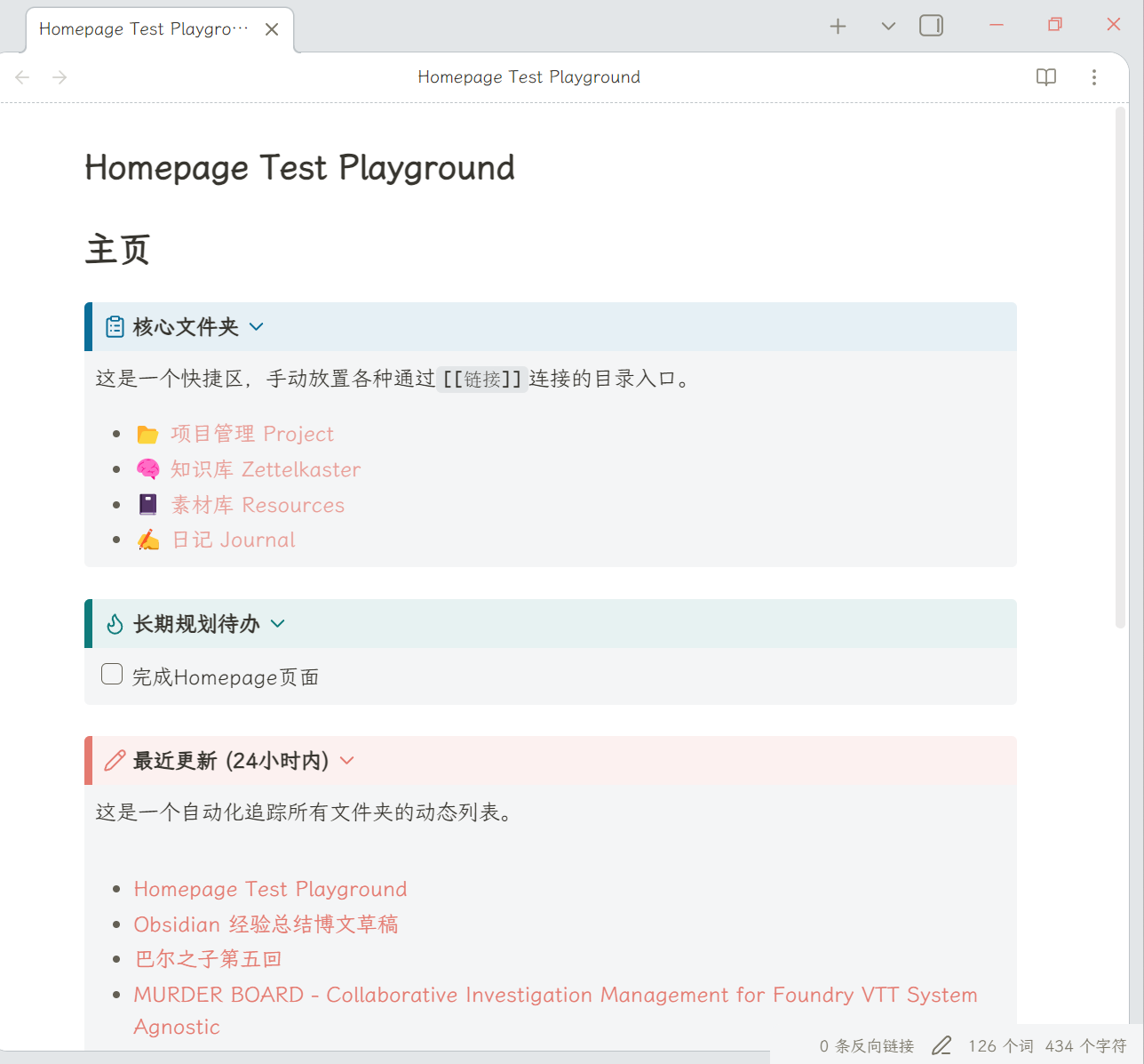 比较常用的使用方法是像这样在一个专门放在首页、命名为“待办事项”的笔记里写下 - [ ] 下周二有一期讲座 📅 2026-2-10,然后可以随时查看这一笔记来提醒自己各种待办事项。进阶一点,可以改动日记默认模板,用一行查询代码在日记里把所有今天到期的任务聚合展示。也可以配合接下来要介绍的 Homepage 插件来配置一个打开 Obsidian 即显示的主页,在主页中你想填入的诸重要内容中使用 todos 代码块加入待办的检索栏目。总之,Tasks 作为待办扩展的小插件,确实让我在任务追踪上有头绪了很多——虽然大多数情况下,我还是在一直给待办画叉。