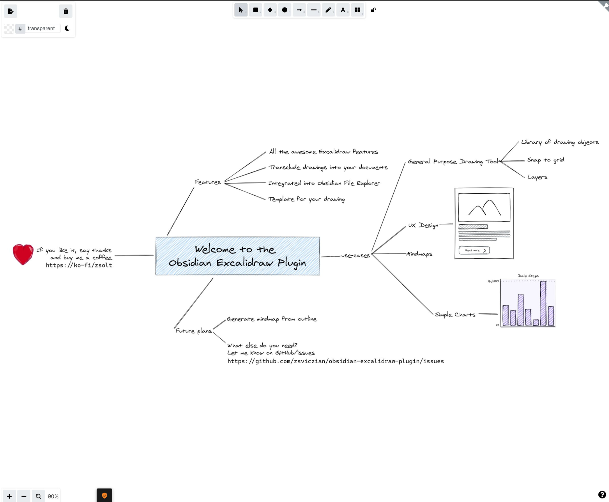 Excalidraw 本身就是一个很有名的白板软件。它可以做到的功能包含白板思维导图、手绘图文混排、编辑自由画板等等。关于它的使用有很多可查询的介绍,我就不多赘述了。总的来说,我使用 Excalidraw 就是拿来乱写乱画,需要的时候直接将笔记作为“卡片”拖入。用来构建思维导图、梳理逻辑结构的时候非常好用。