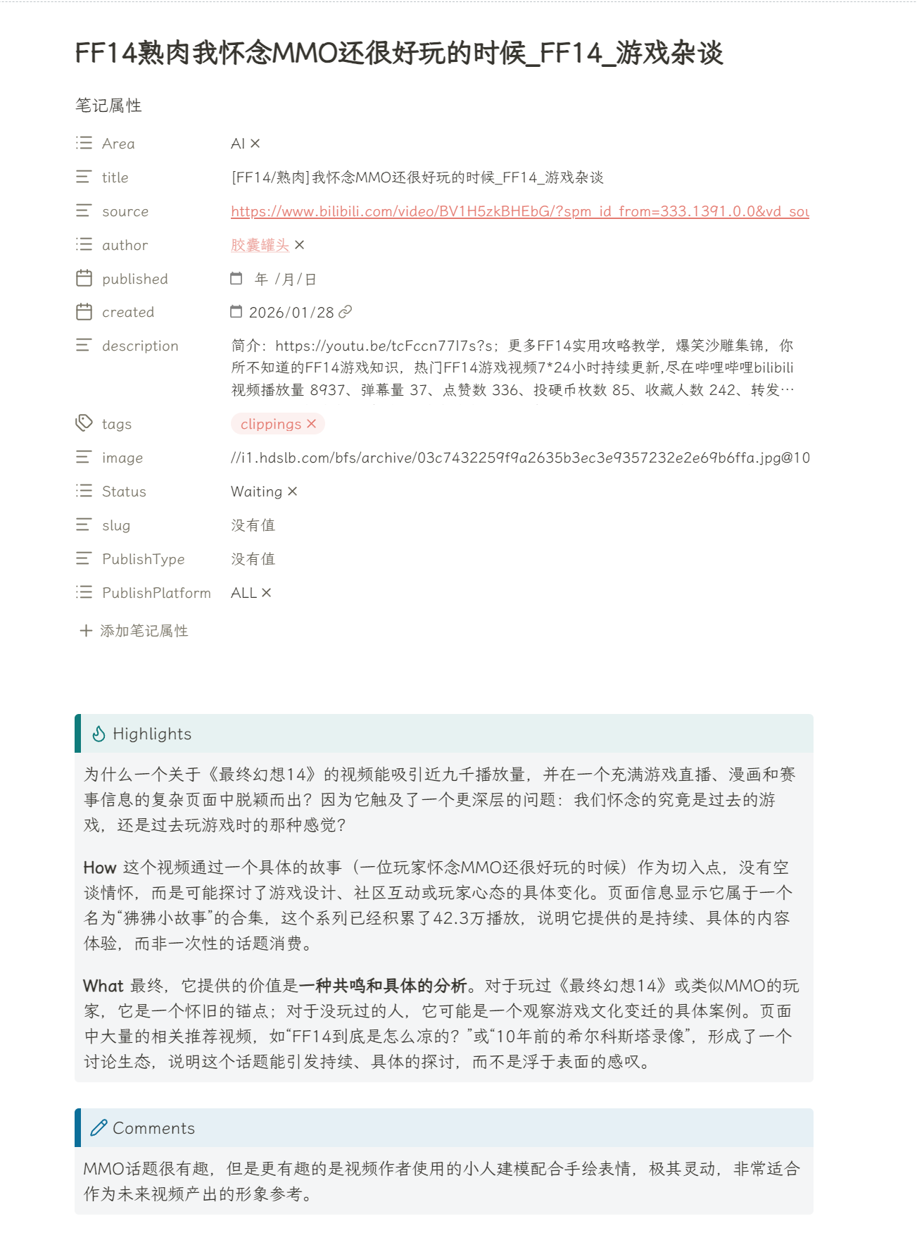 Web Clipper 剪藏示例,其中 Highlights 是由 AI 总结的,Comments 是我自己的评论