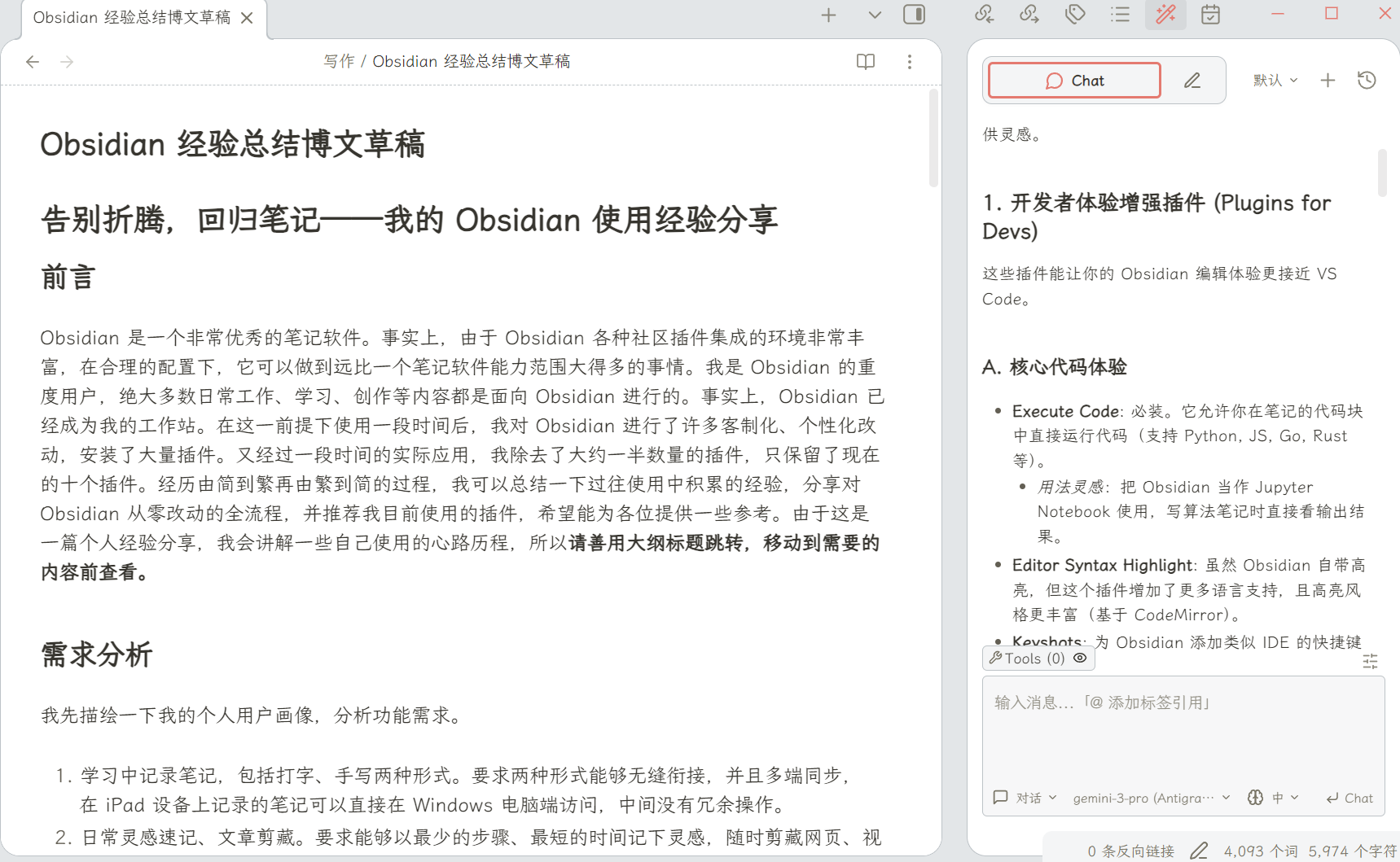 Obsidian 的上限是无限的。这很让人浮想联翩,甚至愿意为之折腾——但是我们都知道,人的精力是有限的。没有必要为了“显得专业”去学复杂的 DataviewJS,也不要为了“好看”装一堆只会拖慢速度的 UI 插件。最好的插件,是你忘记了它的存在,但离了它又觉得寸步难行。最好的笔记软件也是如此。Obsidian 在许多地方不如 Notion,比如笔记发布、官方同步、知识库直接调用LLM对话等等。但这些功能 Obsidian 都能一定程度上实现,而在其他方面 Obsidian 更是有着超越级别的优势。希望这篇文章的内容对你有所帮助。如果有更好的使用建议,欢迎评论。之后我也会持续更新 Obsidian 使用相关经验。